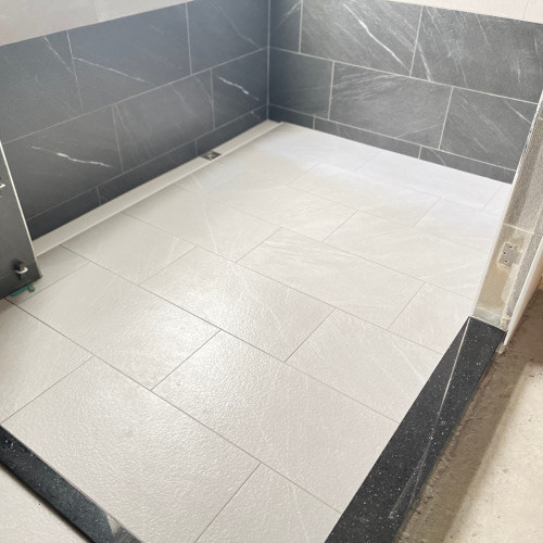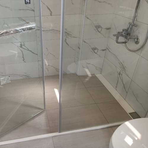 【浴水順】人造石截水槽的最佳進場時機,是在壁磚貼好後,與地磚一併施工,先黏合截水槽,再依序鋪磚,提升施工效率與品質,相當方便迅速。