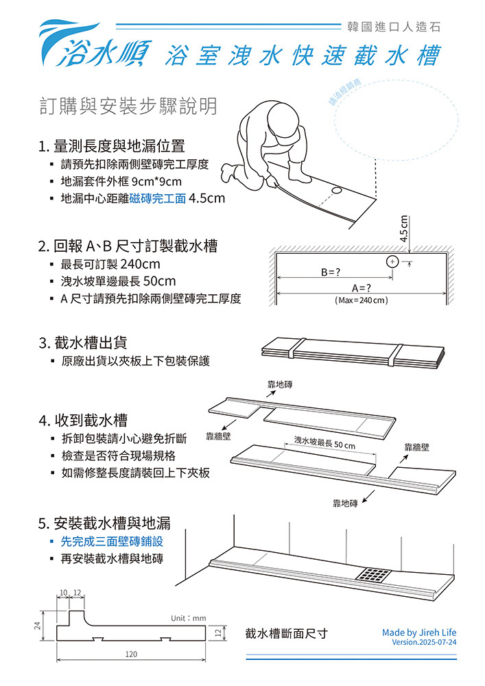 【浴水順】人造石截水槽採用方形外框9*9公分,排水口1.5英吋的落水套件,設計時請規劃落水孔距離磁磚預定完工面「4.5cm」,假如落水頭中心距離牆面較遠,請務必先行改管。泥作地排請選用直徑2英寸或以上之排水接頭,可使後段施工對接更為順利!